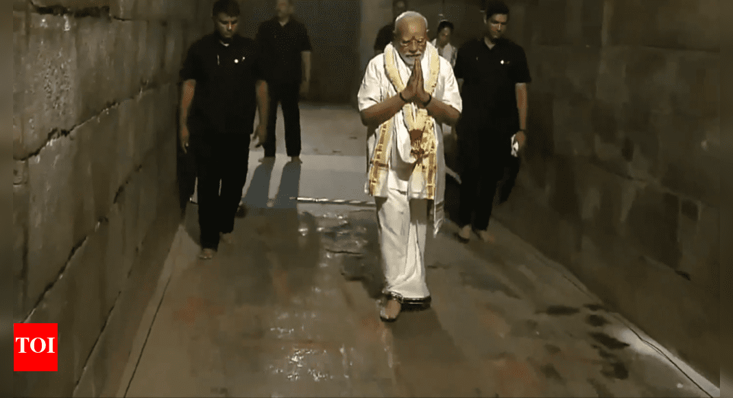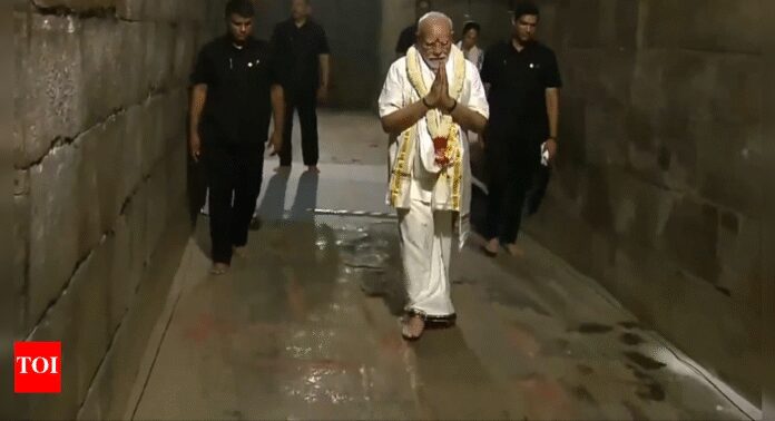 NEW DELHI: Prime Minister Narendra Modi on Sunday participated in the celebration of the birth anniversary of Chola emperor Rajendra Chola I with the Aadi Thiruvathirai Festival at Gangaikonda Cholapuram Temple in Tamil Nadu’s Tiruchirappalli.During the two-day visit to Tamil Nadu, the Prime Minister offered prayers at the Chola-era Lord Brihadeeswara temple amid chants of Vedic and Saivite Thirumurai.PM Modi brought a ‘kalasam’ (metal pot) with traditional decorations which is believed to contain water from River Ganga.Clad in veshti (dhoti), white shirt and angavasthram worn around the neck, the prime minsiter circumambulated the inner corridor of the temple, a part of the great living Chola temples, a UNESCO heritage site. He also offered prayers by conducting a “deeparathanai.”The PM also visited an exhibition organised by the Archaeological Survey of India on Chola Shaivism and architecture.Earlier in the day, PM Modi also held a roadshow in Gangaikonda Cholapuram after his arrival.During the roadshow, the prime minister stood on the running board of his vehicle and waved at the people who lined up on both sides of the road.Gangaikonda Cholapuram was the ‘victory city’ constructed by Rajendra Chola following his victorious maritime expedition to South East Asia about 1,000 years ago.Prime Minister Narendra Modi held a roadshow here on Sunday soon after his arrival to preside over a function to mark the birth anniversary of the iconic Chola king Rajendra Chola-I.