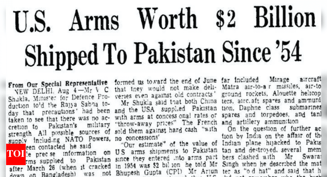 NEW DELHI: The Indian Army on Tuesday waded into the ongoing war of words between India and the US over tariffs and Russian oil, sharing an old newspaper clip detailing decades of military support from Washington to Pakistan in the run-up to the 1971 war.The Army’s Eastern Command at Kolkata posted on ‘X’ a newspaper clip from Aug 5, 1971, highlighting the article’s headline: “US arms worth $2 billion shipped to Pakistan since 1954”. “This day that year build-up of war – Aug 5, 1971. #KnowFacts,” the post said.The newspaper article mentioned the then defence production minister V C Shukla telling RS that both the US and China had supplied Pakistan with arms at “concessional rates or throw-away prices”.The French sold Pakistan arms against hard cash with “no concessions”, while USSR had denied supplying weapons to India’s western adversary. “Our estimate of the value of US arms shipments to Pakistan since they entered into the arms pact in 1954 was $2 billion,” Shukla had said.Army’s dig comes after MEA hit back at US following Trump’s threat to India over its purchase of Russian oil. TNN