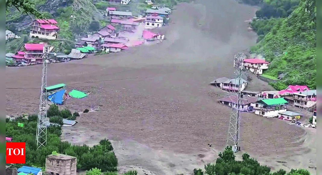DEHRADUN: It wasn’t just the rain. A preliminary geological assessment conducted after Tuesday’s devastating flash flood in Dharali village, suggests a far more complex and violent trigger – a massive collapse of glacial sedimentary deposits, possibly caused by a retrogressive slope failure high up in the mountains.Initial estimates made by experts, based on satellite data and terrain analysis, point to an avalanche of nearly 360 million cubic metres of debris. For perspective, a quick, back-of-the-envelope calculation reveals the figure is roughly equivalent to over 1.4 lakh Olympic-sized swimming pools filled with mud, rocks and glacial debris simultaneously hitting the village at high speed. With such an impact, it’s not surprising that Dharali did not have a chance. The avalanche was mobilised by a sudden release of unstable morainic and glacio-fluvial material-thundering down the Kheer Gad stream into Dharali. The surge reached the village within seconds, flattening over 20 structures and claiming lives of at least four people (as per official figures).Imran Khan, geologist and head of the geology division at Bhutan’s Punatsangchhu-I hydel project, who studied satellite imagery of the area, said “this wasn’t a typical cloudburst”. “The event likely involved a massive detachment of unconsolidated glacial deposits, perched roughly 7 km upstream at an elevation of 6,700m. Heavy rainfall may have acted as the trigger-but the disaster was waiting to happen.” The glacial deposit in question, spanning over 1.1 sqkm with an estimated vertical thickness of 300m, is located in a hanging trough – an inherently unstable geological feature. The steep terrain, combined with narrow, pre-incised channels in the Kheer Gad stream, allowed the debris to accelerate at terrifying speeds, leaving virtually no time for residents to escape. “The stream draining this area has a high longitudinal gradient, limited lateral confinement, and sharp incision paths-all of which contribute to rapid debris flow mobilisation,” Khan wrote. He added surface runoff and percolation, following days of intense rain, may have loosened the sediment, triggering the collapse.Rajiv Saran Ahluwalia, geologist at Doon University, told TOI that at velocities of 6-7m per second, debris-laden flows are capable of destroying any structure in their path. “And if the velocity doubles, the debris-carrying capacity increases by a factor of 64,” he said. Experts believe glacial melt, intensified by elevated temperatures in the days preceding the disaster, may have compounded the instability. A senior glaciologist said the precise cause will only be known once real-time satellite imagery – captured just before and after the event – is analysed or a ground team conducts a survey upstream. “It appears the flash flood originated across three narrow valleys, with the most violent surge occurring in the Kheer Gad. Something extraordinary happened up there. It needs urgent investigation.”Geologists have for long been calling for a ban on construction along steep nala corridors and debris flow paths, particularly in pilgrimage-centric regions like Gangotri. “We can no longer afford to ignore hidden upstream hazards – especially in zones with growing human and pilgrimage footprints,” said a geologist involved in the assessment.