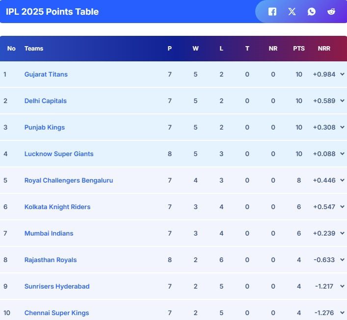 IPL 2025 Points Table After RR vs LSG Game: Lucknow Super Giants Fourth, Rajasthan Royals Down To… | Cricket News –
