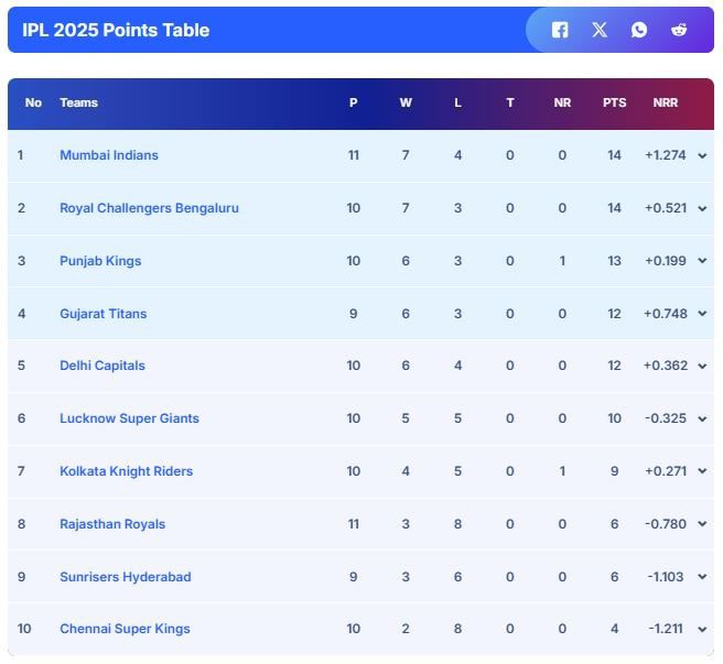 IPL 2025 Points Table, Orange Cap, Purple Cap: MI Take Top Spot; RCB, PBKS Slip To… | Cricket News –