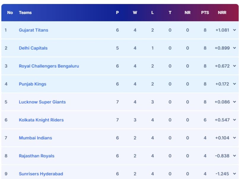 No change occurred in the Orange Cap and Purple Cap leaderboards, which are still led by Nicholas Pooran and Noor Ahmad respectively. KKR bowlers Harshit Rana and Varun Chakravarthy are on 10 wickets each, two behind Noor.