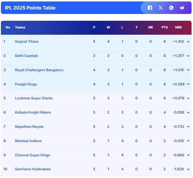 IPL 2025 Points Table, Purple Cap, Orange Cap: Gujarat Titans Go Top Of Table With Win Over Rajasthan Royals | Cricket News – Latest Cricket News, Cricket Info, Sports News Updates – NDTVSports.com | My Update India